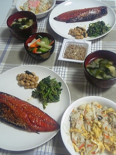 6/19☆夜ご飯 6月 20, 2006 yumi☆献立☆ ・ちらし寿司 ・お味噌汁 ・鯖みりん焼き ・ほうれん草の胡麻和え ・お豆 — 旦那さんの実家からのお裾分けがあって 平日にも関わらず、充実ご飯に♪二人揃って夜ご飯。