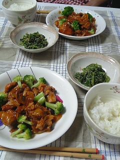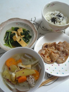 9/6☆夜ご飯 9月 6, 2006 yumi☆献立 ・豚の生姜焼き ・豚汁 ・小松菜と油揚げのおひたし ・ごはん — ひさびさの自炊! 久しぶりに作るのは、やっぱりいつものメニュー(笑) 体調が良くなったら、色んな献立に挑戦しよう~!