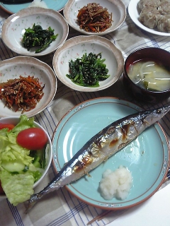 9/10☆夜ご飯 9月 13, 2006 yumi☆献立☆ ・秋刀魚の塩焼き ・大根とわかめのお味噌汁 ・ほうれん草の胡麻和え ・きんぴらごぼう ・サラダ — 秋刀魚はおいしい♪やっぱり秋はいいな。 味とは全然関係ないけど、秋刀魚を切ってから お皿に盛り付ければ良かったなって思ったり。