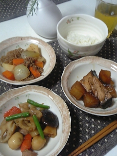 9/13☆夜ご飯 9月 13, 2006 yumi☆献立☆ ・ブリと大根の煮付け ・肉じゃが ・筑前煮 — 今日は時間があったので、和食3品を作りました☆ 明日からのおかず用に、この後、さらに“ひじきの煮物”を追加!