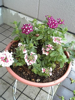 (左)玄関の前の花 (中)ベランダでトマトの栽培開始 (右)ネギも栽培開始