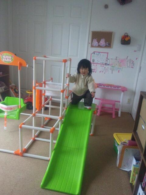 幼稚園の送り迎えや用事などで、なかなか杏菜ちゃん優先で遊びに連れて行くことができないので、室内で遊べるジャングルジム&ブランコ&滑り台を買ってみました!!
