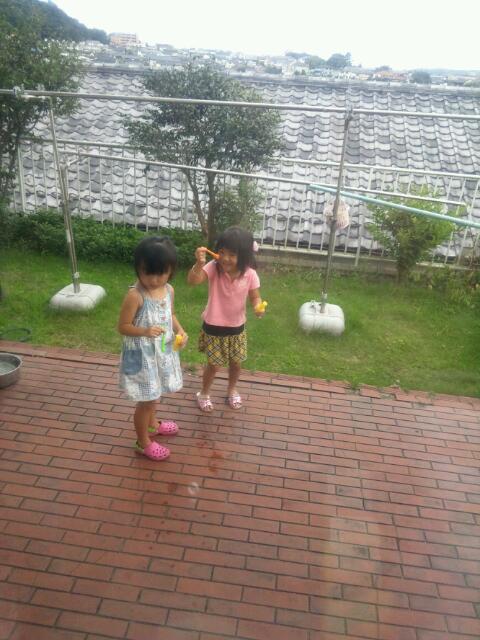 暑くても、途中、お庭でシャボン玉したりと元気な二人。