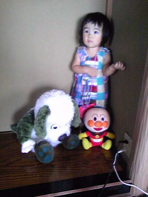 大好きなワンワンとアンパンマンのぬいぐるみと一緒に。